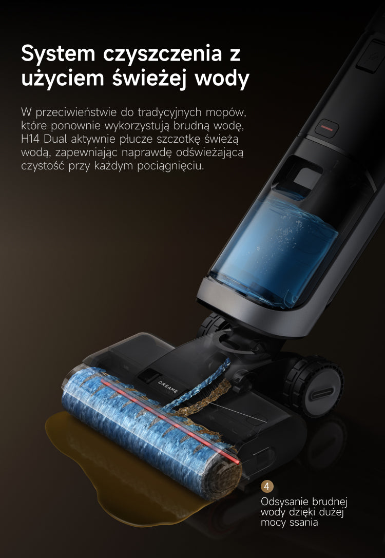 ⁵ 0,2 g śladów wodnych: H14 Dual pozostawia mniej niż 0,2 g śladów wodnych po 4 rundach mycia drewnianej podłogi o długości 60 cm z prędkością 20 cm/s, na podstawie danych z wewnątrzzakładowego laboratorium. Rzeczywiste wyniki mogą się różnić w zależności od rodzaju podłogi, użytkowania i warunków środowiskowych. Raport nr: ZMX-140514-006-17