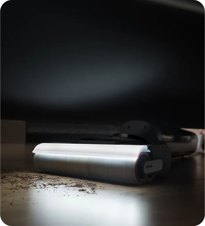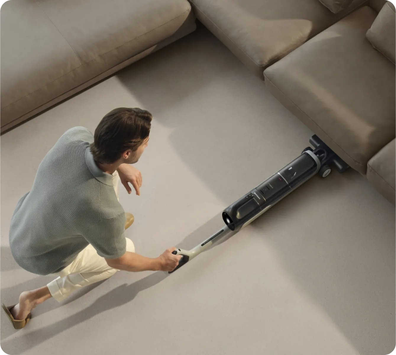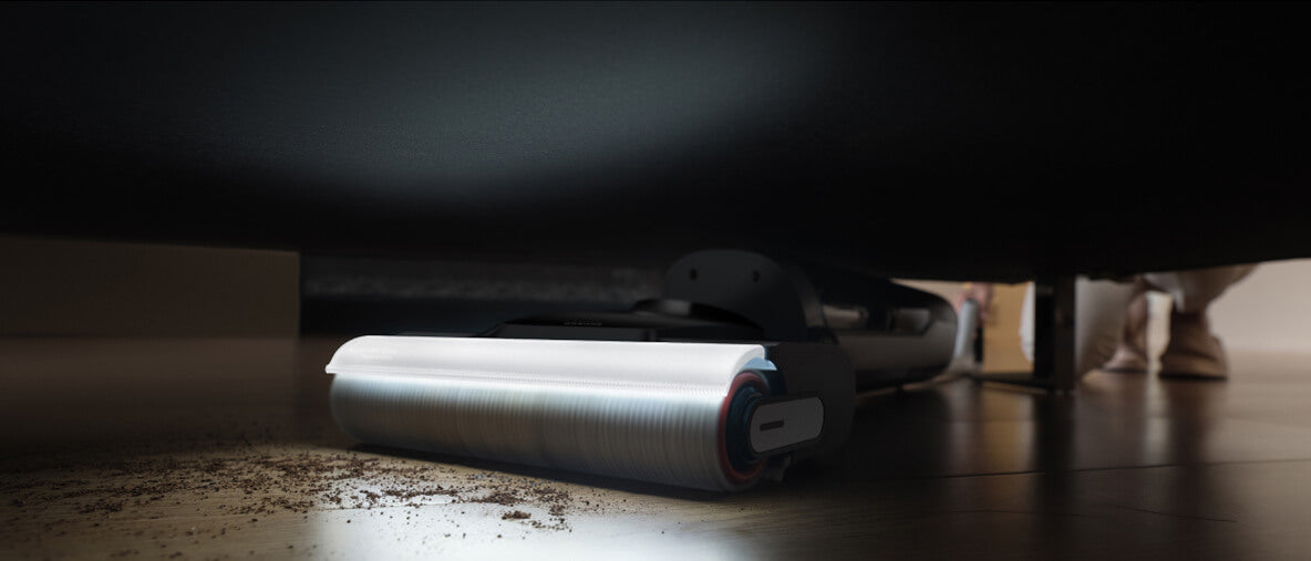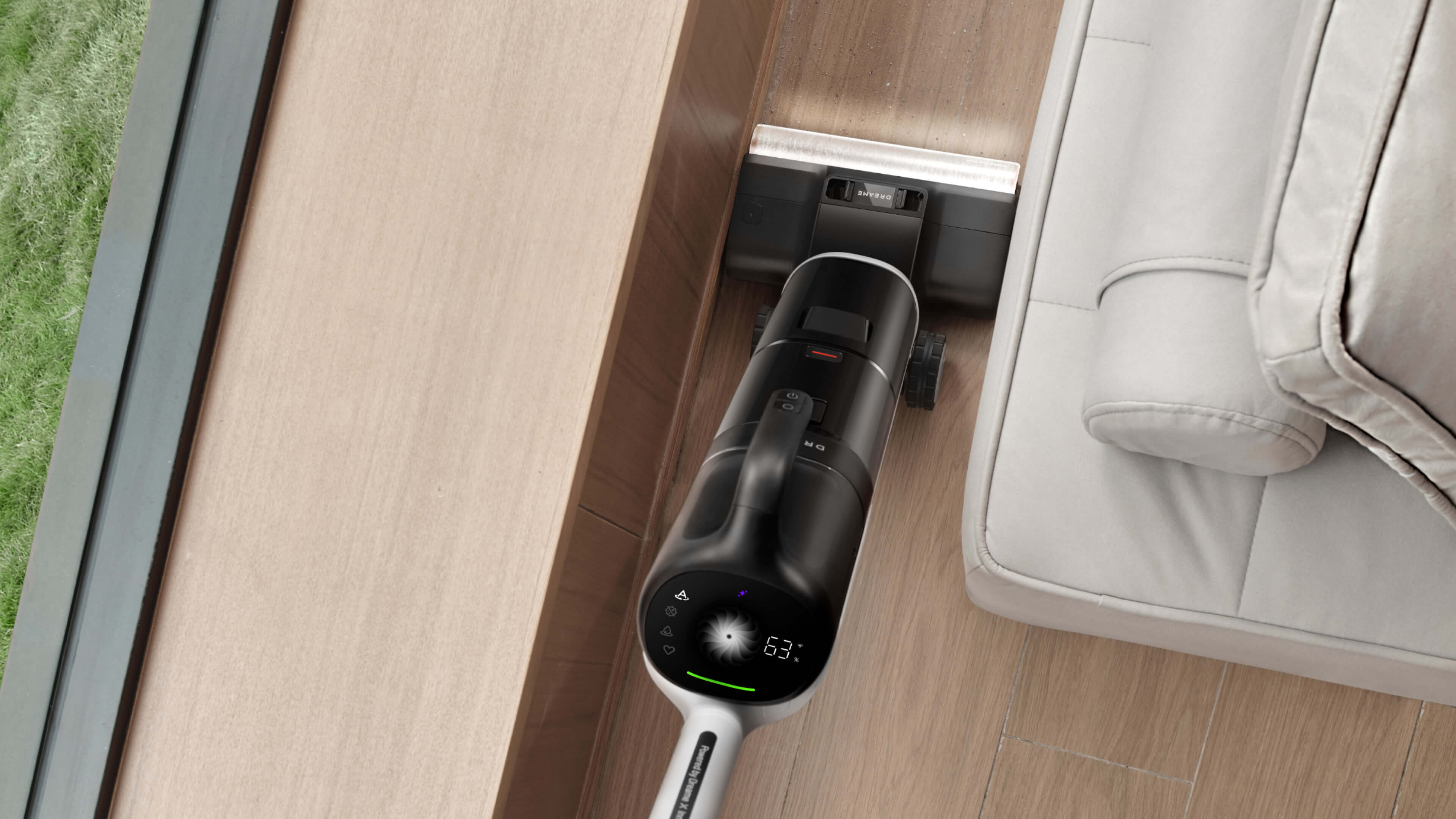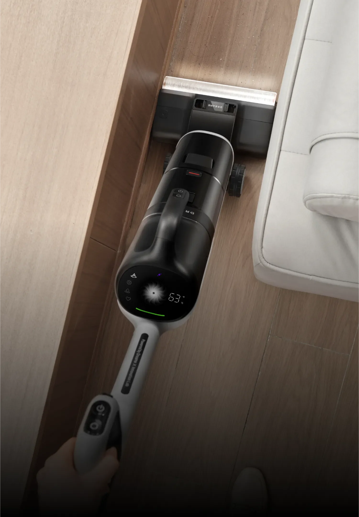 ¹180°, 14 cm, 9,8 cm: cały korpus odkurzacza mieści się w przestrzeniach o wysokości zaledwie 14 cm, a głowica szczotki — zaledwie 9,8 cm. Gdy odkurzacz znajduje się w pozycji płaskiej, uchwyt silnika znajduje się 18 cm od podłoża, jak wynika z danych uzyskanych z naszego wewnętrznego laboratorium.