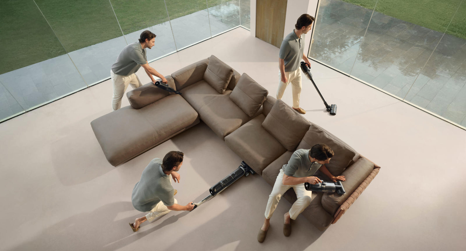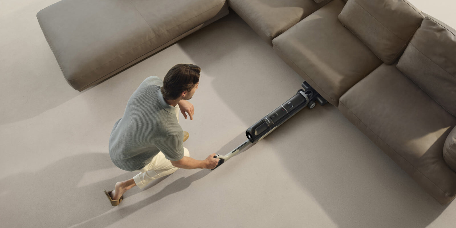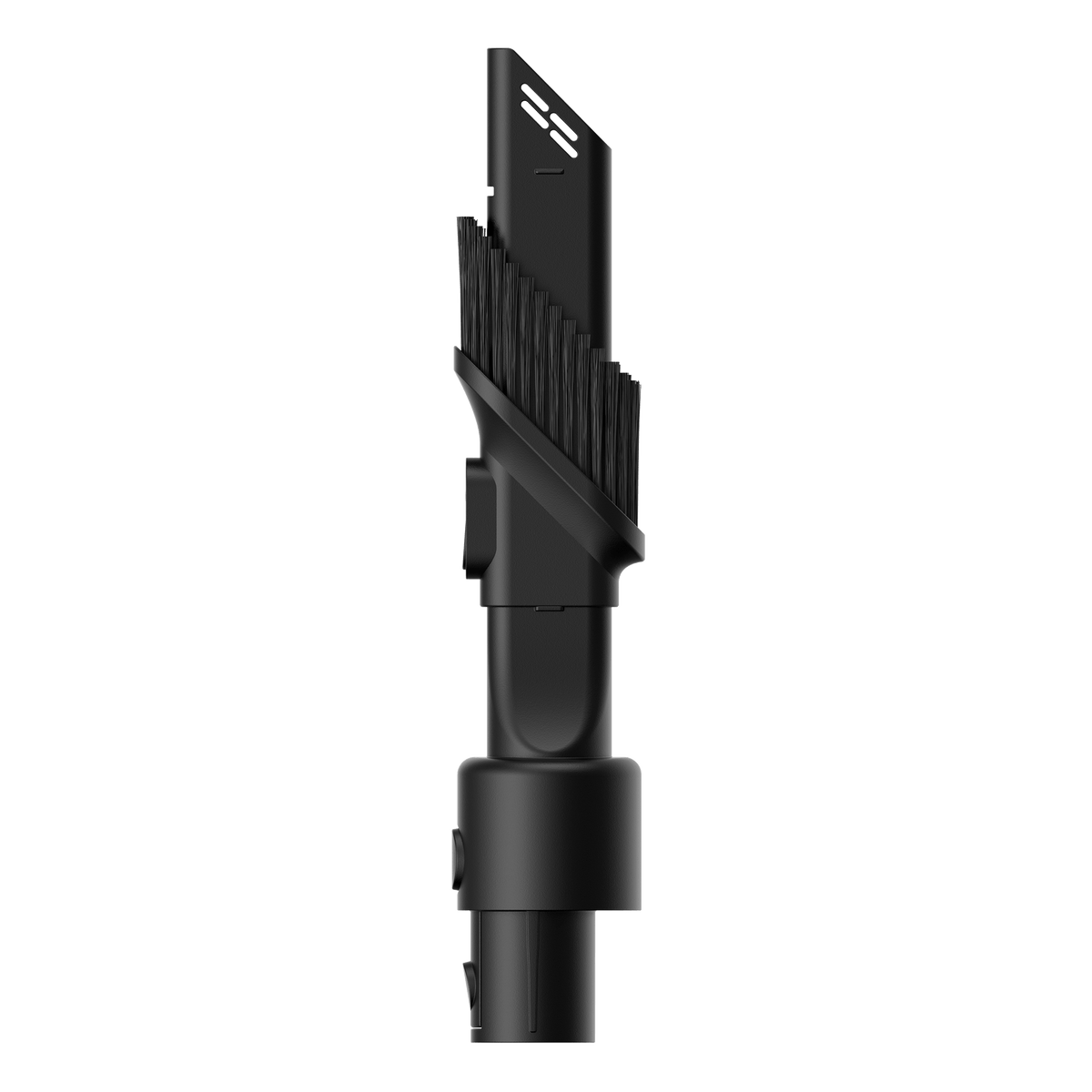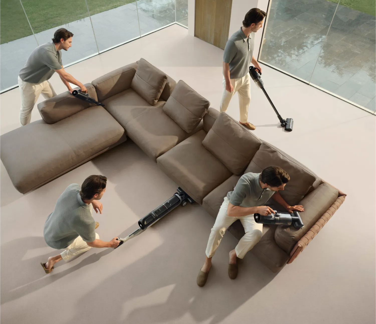 ¹180°, 14 cm, 9,8 cm: cały korpus odkurzacza mieści się w przestrzeniach o wysokości zaledwie 14 cm, a głowica szczotki — zaledwie 9,8 cm. Gdy odkurzacz znajduje się w pozycji płaskiej, uchwyt silnika znajduje się 18 cm od podłoża, jak wynika z danych uzyskanych z naszego wewnętrznego laboratorium.