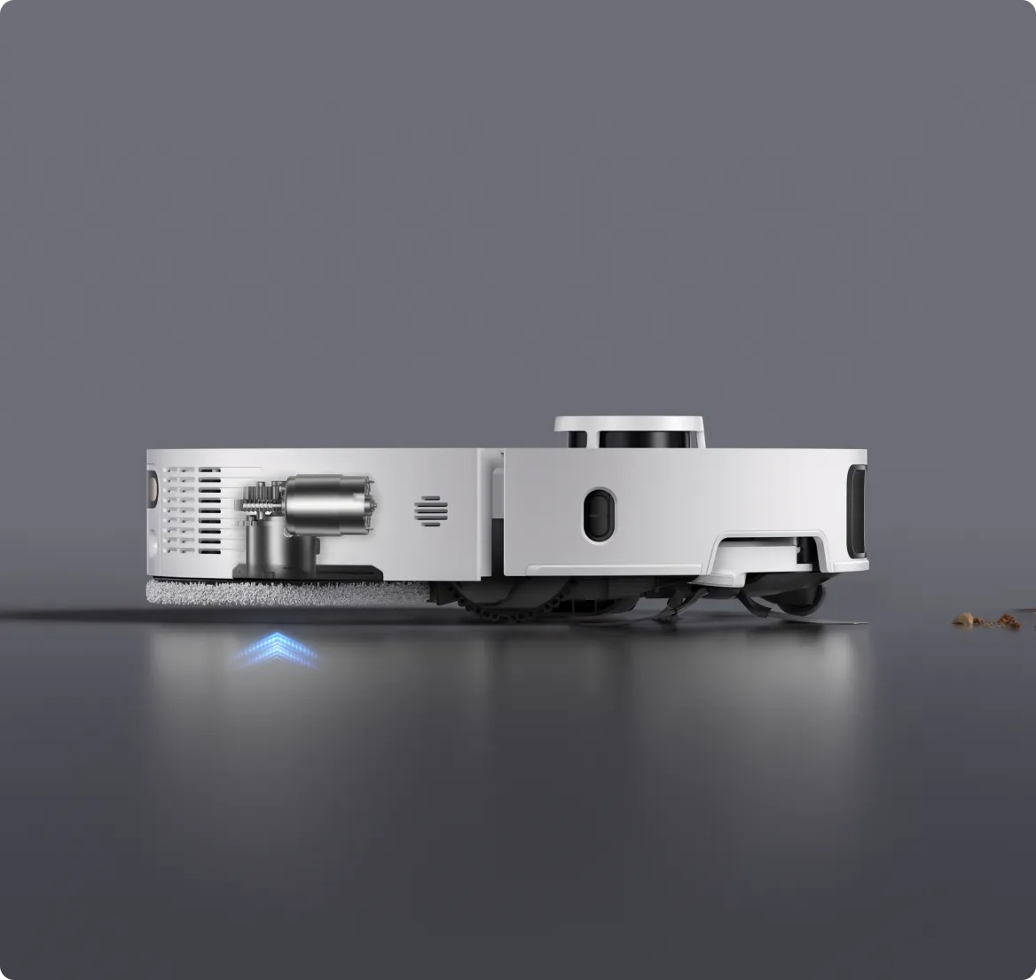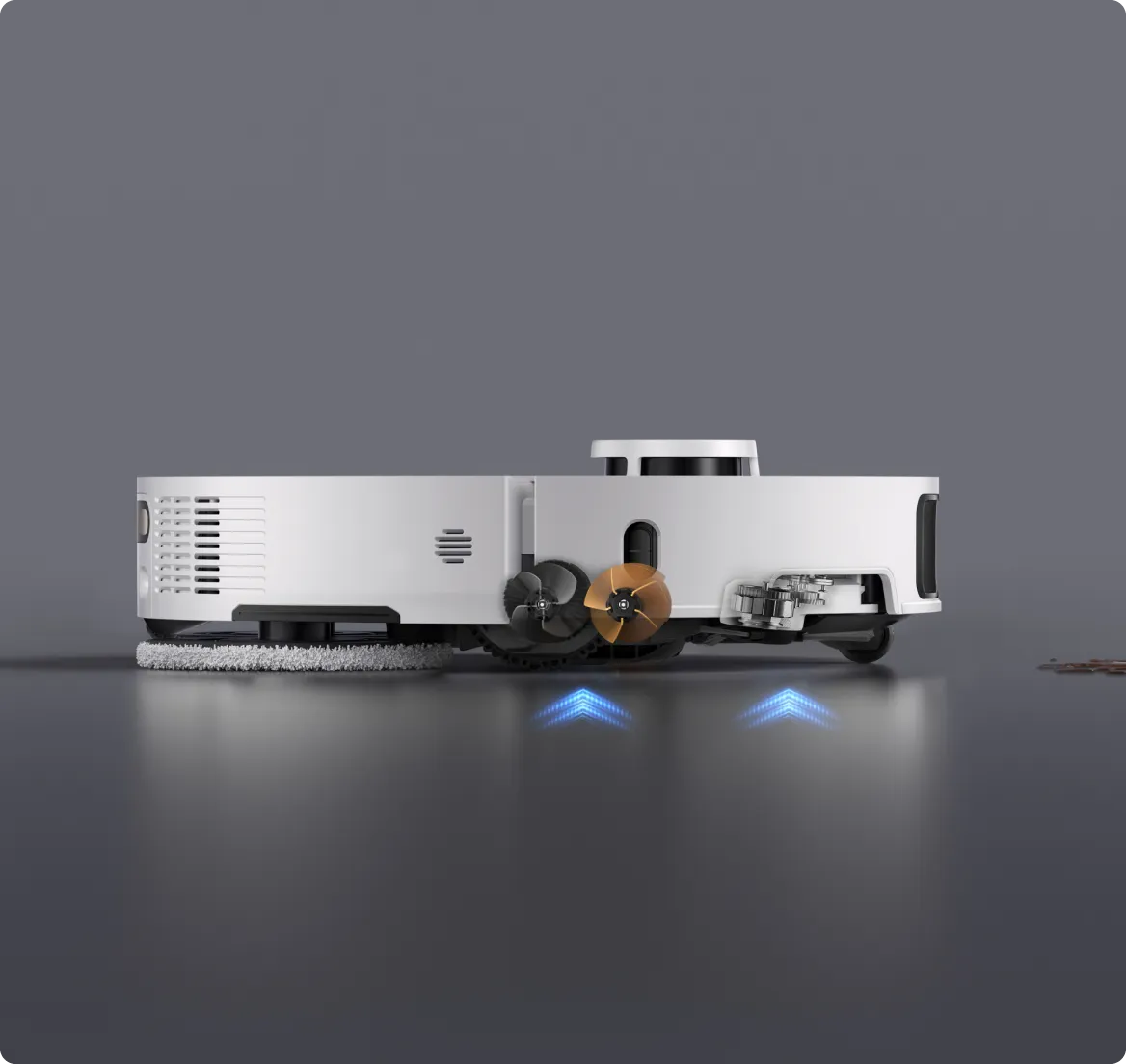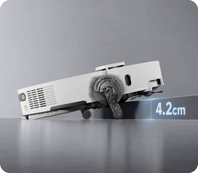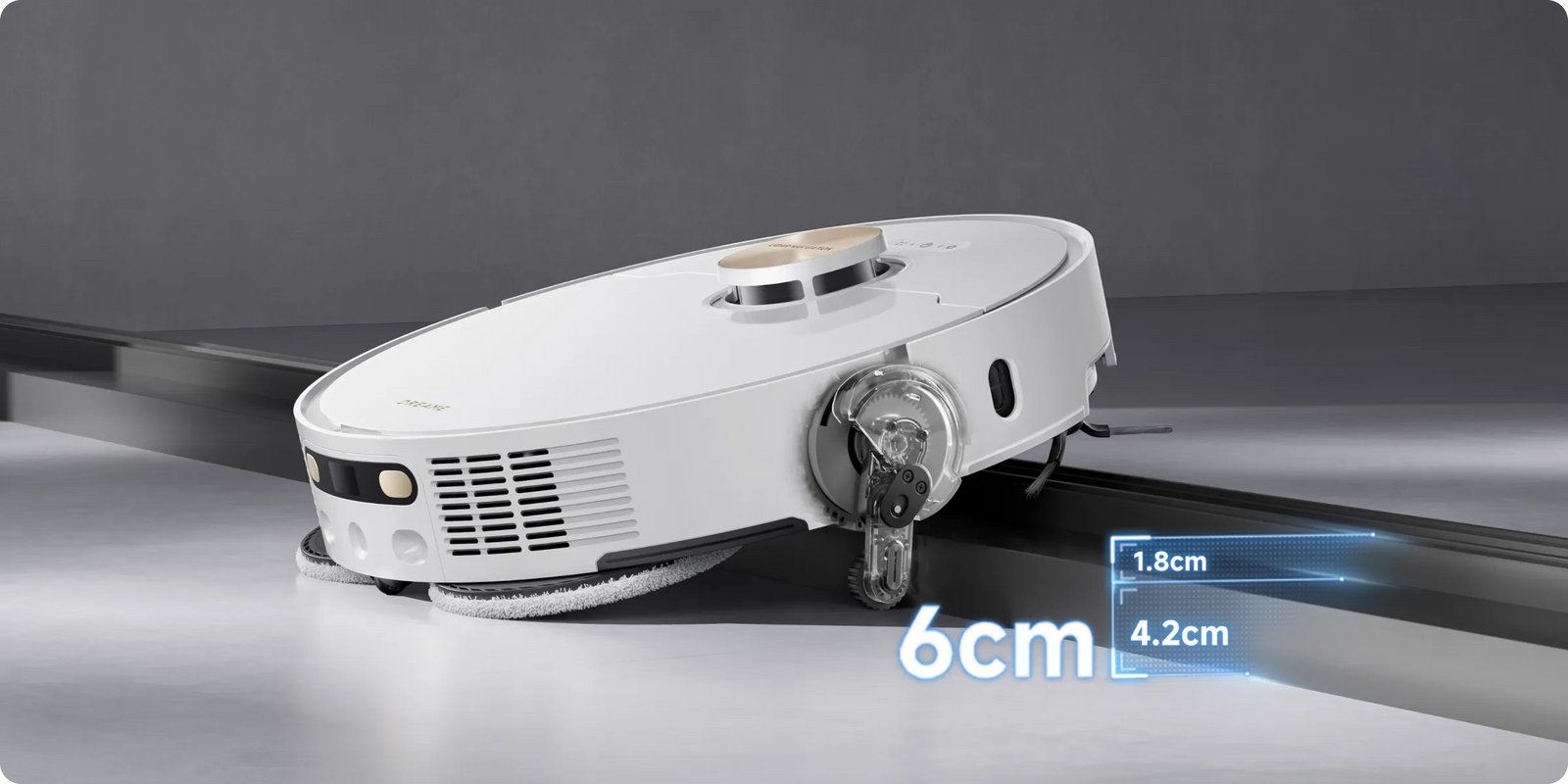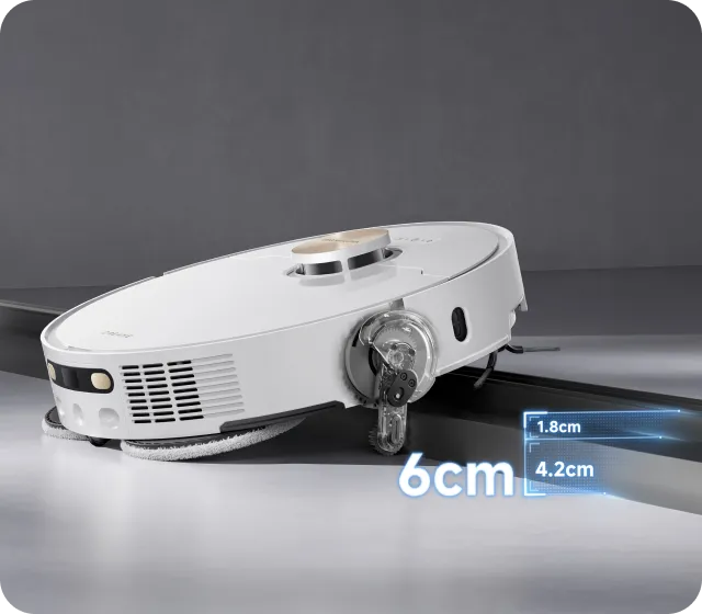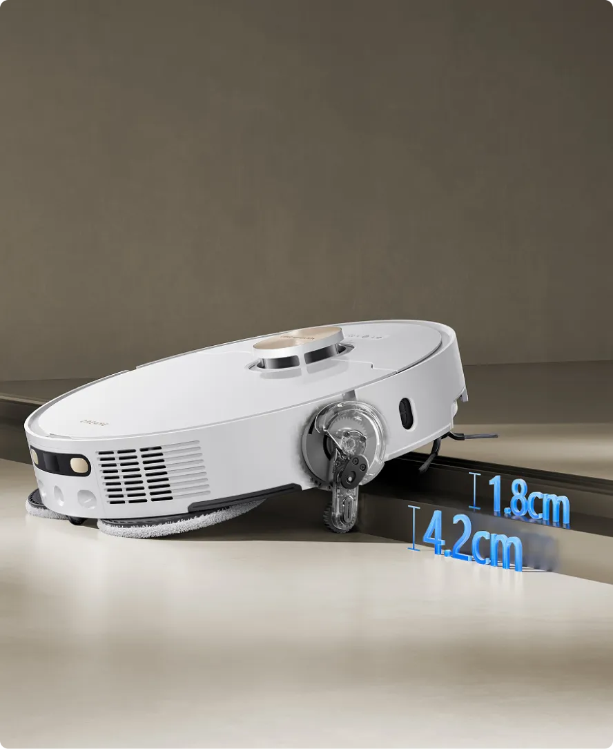 * 10,5 mm: na podstawie testów przeprowadzonych przez wewnątrzzakładowe laboratorium. Różnica w wysokości automatycznego odkurzacza przed i po podniesieniu mopów wynosi 10,5 mm.
