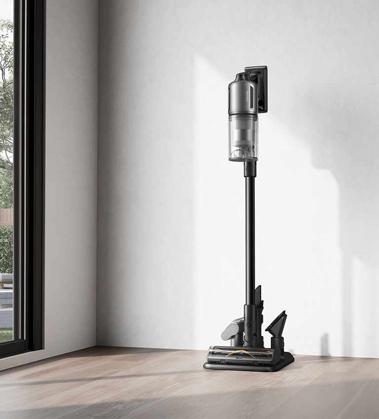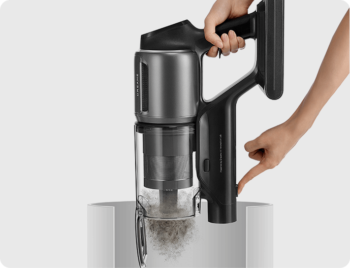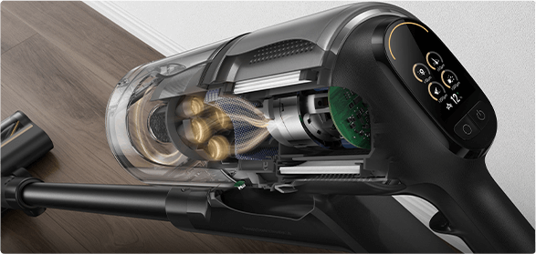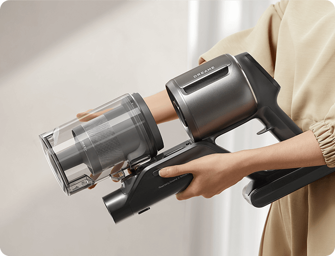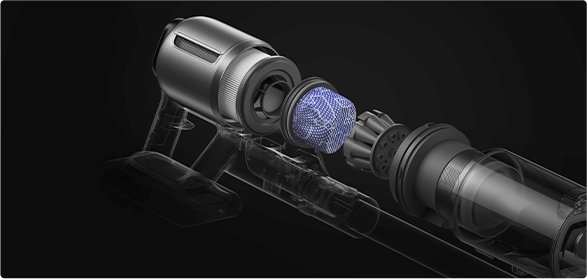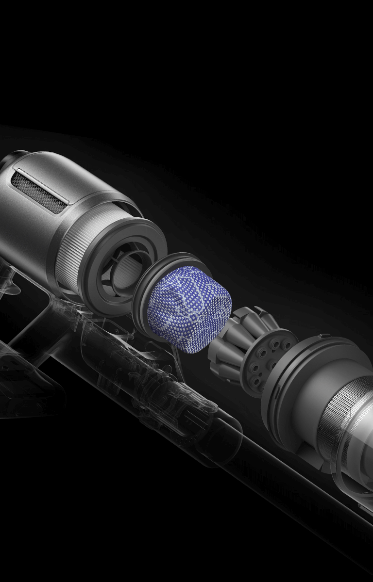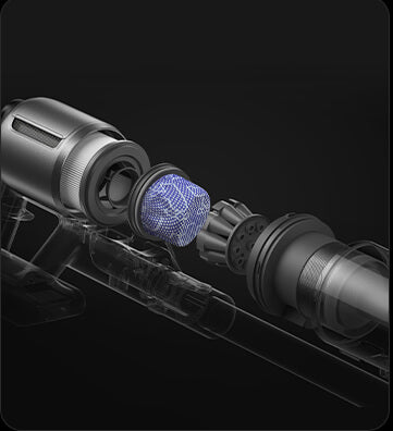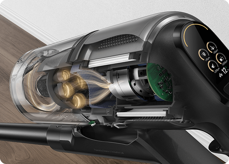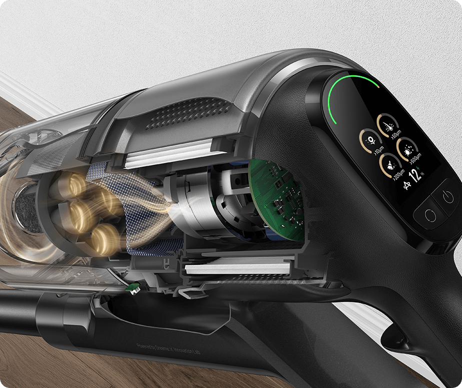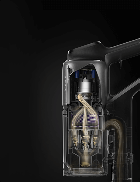 * 310 AW, 150,000 obr./min: w oparciu o dane z wewnątrzzakładowego laboratorium; rzeczywista wydajność może się różnić. Moc ssania 310 AW, to najwyższa wartość na linii produkcyjnej bezprzewodowych odkurzaczy pionowych Dreame; stan na maj 2024 r.